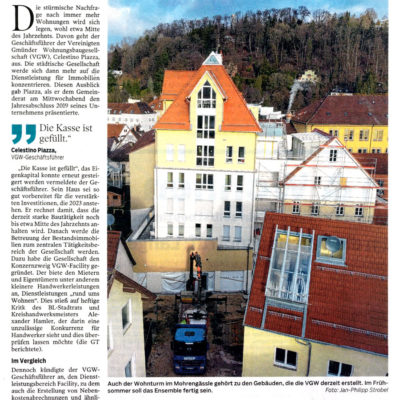 AKTUELLES AKTUELLES Stadtentwicklung 11. Juli 2025 mehr ... Kauf Buhlgässle 8 20. Mai 2025 mehr ... Kombibau in Weiler 12. Mai 2025 mehr ... Jubiläum 25 Jahre Jürgen Nagel 22. April 2025 mehr ... Das neue Dienstleistungszentrum 22. April 2025 mehr ... Eröffnung Dienstleistungszentrum Rehnenhof 17. April 2025 mehr ... Richtfest – Kinderhaus Kunterbunt 6. Februar 2025 mehr ... Spatenstich – Weiler i.d.B. 27. November 2024 mehr ... Mietspiegel – Schwäbisch Gmünd 21. November 2024 mehr ... Tagespflege – Riedäcker 14. November 2024 mehr ... Wohnen & Leben 1-2024 5. August 2024 mehr ... Blumenversteigerung im VGW-Keller 25. Juli 2024 mehr ... Kinderland Kunterbunt 24. Juli 2024 mehr ... Neue Mülltonnen bringen Platzprobleme 17. Juli 2024 mehr ... Richtfest Jugendtreff Hardt 10. April 2024 mehr ... Spatenstich Zeppelinweg 2. April 2024 mehr ... 36. Handwerker Ausstellung 22. Februar 2024 mehr ... Vegetieren aufhört und Wohnen beginnt 21. Februar 2024 mehr ... Handwerk fehlt der goldene Boden 21. Februar 2024 mehr ... Eisbahn Gmünd Eröffnung 2024 15. Januar 2024 mehr ... Abschied “Kunterbunt” 11. Januar 2024 mehr ... Besuch “Warme Stube” 8. Januar 2024 mehr ... Wirtschaftsforum 14. Dezember 2023 mehr ... Spende für Zonta Club 14. Dezember 2023 mehr ... Lebenshilfe belebt den “Kronprinzen” 14. Dezember 2023 mehr ... Zurück in die Schwanen-Zukunft Interview 23. November 2023 mehr ... Ein neuer Platz, der eher ein Park werden soll 21. November 2023 mehr ... Zurück in die Schwanen-Zukunft 21. November 2023 mehr ... Stadtkapelle braucht Spenden für Uniform 7. November 2023 mehr ... Hardt: “Kellerkinder” werden bald “Sonnenhügelkinder” 31. Oktober 2023 mehr ... Schwäbische Gemütlichkeit für den Zeiselberg 18. Oktober 2023 mehr ... 33. Alb-Marathon 11. Oktober 2023 mehr ... Unbreak my Hardt 9. Oktober 20239. Oktober 2023 mehr ... Der “Schwanen” soll bald wieder strahlen 4. September 2023 mehr ... Zeiselberg 2. August 2023 mehr ... Schwanen in der Vorderen Schmiedgasse 2. August 2023 mehr ... Klare Konturen für das Hardt der Zukunft 24. Juli 2023 mehr ... Sportlich engagiert “Playa de Gamundia” 30. Juni 2023 mehr ... Coffeebike für die Kirchengemeinde St.Michael 27. Juni 2023 mehr ... 10 Jahre Dorfladen Großdeinbach 15. Mai 2023 mehr ... Richtfest 10.05.2023 Riedäckern, Bettringen 15. Mai 2023 mehr ... Hardtfest! Feiern verbindet am 07.05.2023 3. Mai 2023 mehr ... Benefizveranstaltung am 28.03.2023 16. März 202316. März 2023 mehr ... VGW Jubiläumsfilm I 100 Jahre „ZUHAUSE. IN GMÜND.“ 29. Januar 202227. Januar 2022 mehr ... 30 neue Wohneinheiten in Straßdorf, Käppelesäcker IV 20. August 202120. August 2021 mehr ... Ausstellungseröffnung 100 Jahre VGW 15. Juli 202115. Juli 2021 mehr ... Der VGW Fotowettbewerb für unsere Mieter 29. April 202115. Juli 2021 mehr ... Gmünder Heimatgefühl mit Zukunft 8. April 20219. April 2021 mehr ... Starke Nachfrage nach neuen Wohnungen sinkt bald 5. Februar 202125. März 2021 mehr ... Wetzgau bekommt ein neues Stadtteilzentrum 25. Januar 202125. März 2021 mehr ... “Schwanen” bliebt Gasthaus 20. Dezember 202025. März 2021 mehr ... Bezahlbar und vorhanden 17. Dezember 202010. Mai 2021 mehr ... Elf Millionen Euro für neuen Wohnraum 9. Dezember 20208. April 2021 mehr ... Generationenwohnen für Bargaus neues Baugebiet 4. November 20208. April 2021 mehr ... VGW holt St. Katharina aus dem Dornröschenschlaf 16. Oktober 202025. März 2021 mehr ... Die VGW als Dienstleister 13. Oktober 20208. April 2021 mehr ... Gmünds Willkommenskultur erweitert 30. September 20208. April 2021 mehr ... Richtfest an den Gamundia-Häusern 30. September 20208. April 2021 mehr ... VGW spendet Geld für die Augustinus Vesperkirche 19. Dezember 20188. April 2021 mehr ... Spatenstich für das Neubauvorhaben in der Buchstraße 13. Juni 201813. Juni 2018 mehr ... Wechsel im VGW-Aufsichtsrat 13. Juni 201813. Juni 2018 mehr ... VGW spendet zwei Bänke für einen Bolzplatz 8. April 20178. April 2021 mehr ...